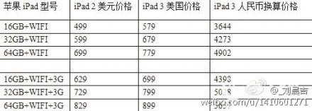 新浪微博上流出一幅疑似 iPad 3 建議售價圖片,16GB/32GB/64GB WiFi 版為 US$579、US$679 及 US$779,3G 版為 US$699、US$799、US$899,全線 WiFi 版加價 US$80,而 3G 版則加 US$70 !當然暫時仍未能確定,但由於新一代 iPad 將使用 Retina Display,成本增加了不少,實在不拆除需要加價。當然,沒有人知這是否真實…但如果加一點價,實在不足為奇!